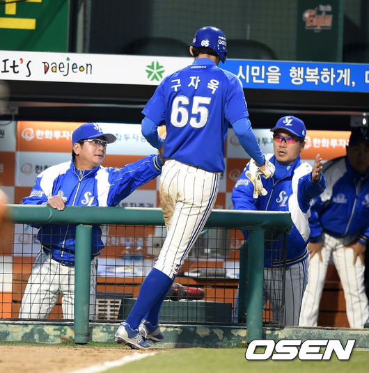2회초 2사 2루에서 삼성 김상수의 선취 1타점 좌전 적시타에 구자욱이 홈을 밟고 더그아웃에서 류중일 감독과 하이파이브를 하고 있다.