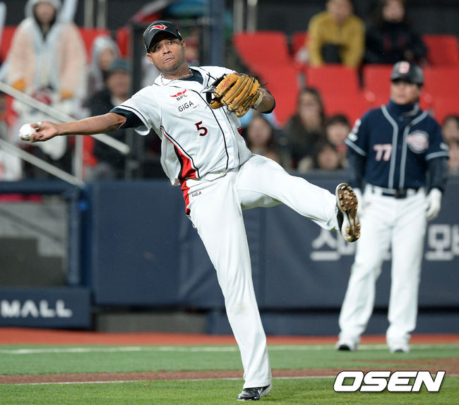 3회초 1사 만루에서 kt 마르테가 두산 정수빈의 타구를 잡아 1루로 송구하고 있다.