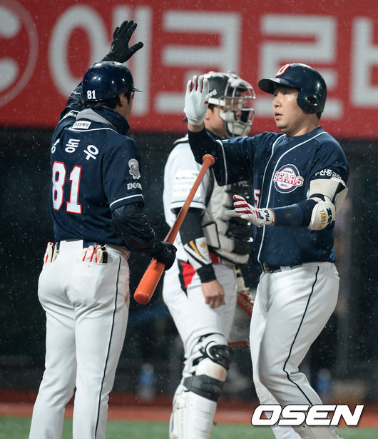 4회초 무사에서 두산 양의지가 중월 솔로 홈런을 치고 강동우 코치와 하이파이브를 하고 있다.