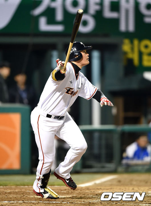 3회말 2사 1루에서 한화 이성열이 역전 1타점 적시 3루타를 날리고 있다.