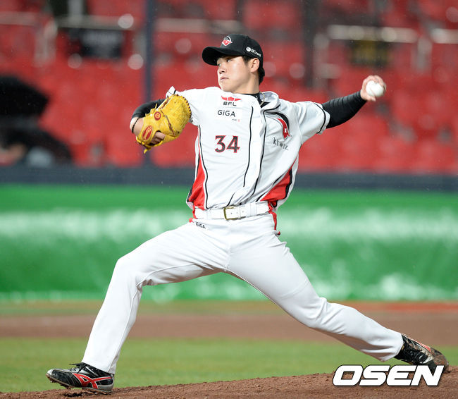 4회초 무사 kt 심재민이 힘차게 공을 던지고 있다.