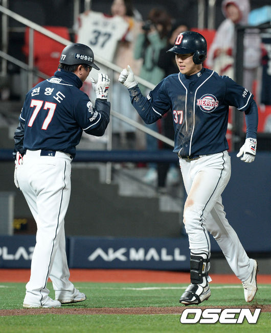 6회초 1사 1루에서 두산 박건우가 좌월 투런 홈런을 치고 전형도 코치와 하이파이브를 하고 있다.