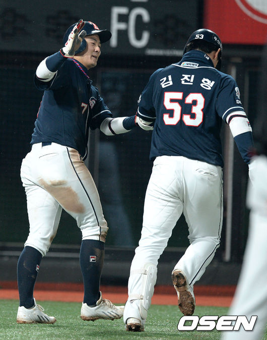 7회초 무사 2루에서 두산 김진형이 좌월 투런 홈런을 날리고 홈을 밟은 2루주자 최주환의 축하를 받고 있다.