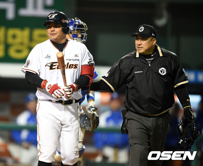 7회말 1사 3루에서 한화 김태균이 삼성 신용운의 투구에 맞으며 괴로워하고 있다.
