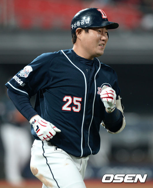 7회초 2사 1,3루에서 두산 양의지가 외야플라이로 물러나며 미소를 짓고 있다.