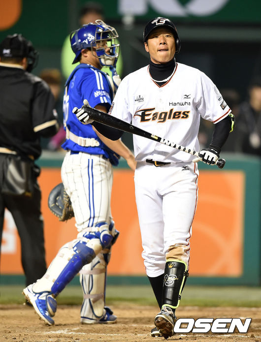 8회말 2사 1루에서 한화 권용관이 삼진으로 물러나고 있다.