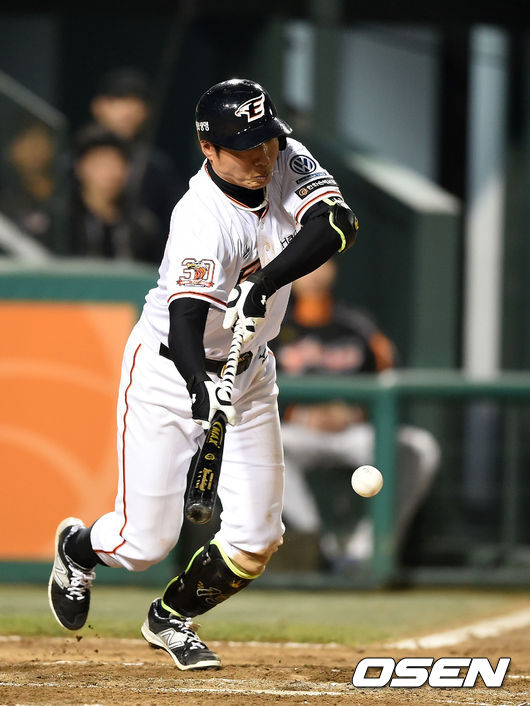 8회말 2사 1루에서 사이클링 히트에 3루타를 남겨 둔 한화 권용관이 기습 번트를 시도하고 있다.