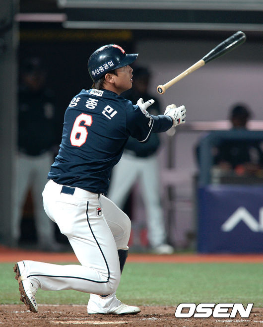8회초 1사 1루에서 두산 양종민이 좌중월 투런 홈런을 치고 있다.