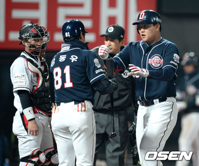8회초 무사에서 두산 오재일이 좌월 솔로 홈런을 치고 홈에서 강동우 코치와 하이파이브를 하고 있다.