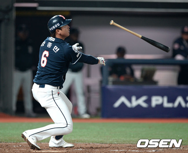 8회초 1사 1루에서 두산 양종민이 좌중월 투런 홈런을 치고 있다.