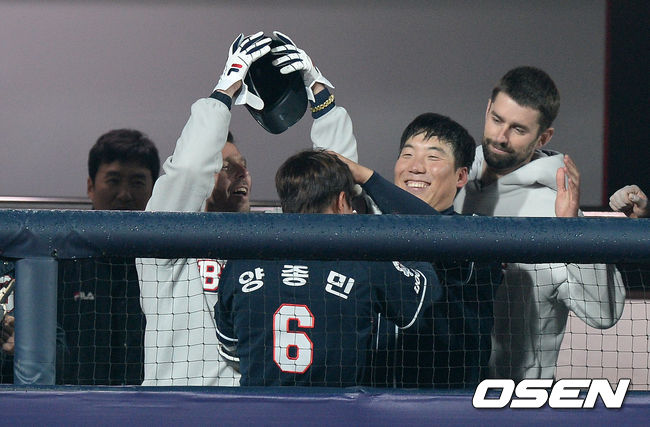 8회초 1사 1루에서 두산 양종민이 좌중월 투런 홈런을 치고 더그아웃에서 동료들의 축하를 받고 있다.