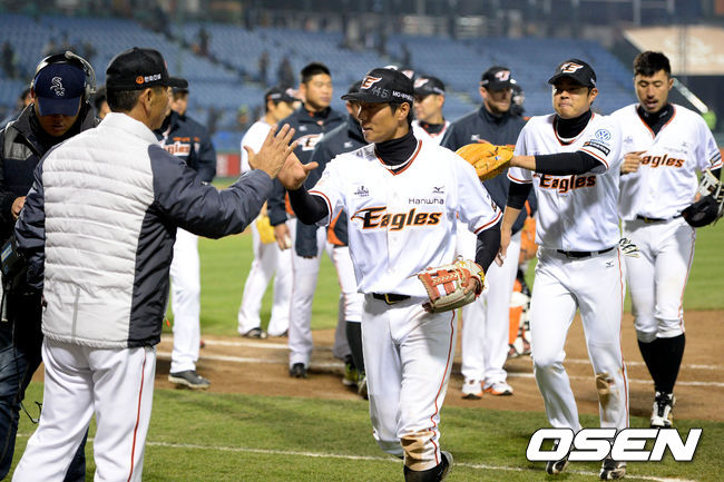 경기후 한화 김성근 감독이 권용관과 하이파이브를 하고 있다./jpnews@osen.co.kr
