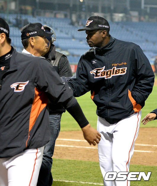 경기후 한화 김성근 감독이 유먼과 하이파이브를 하고 있다./jpnews@osen.co.kr