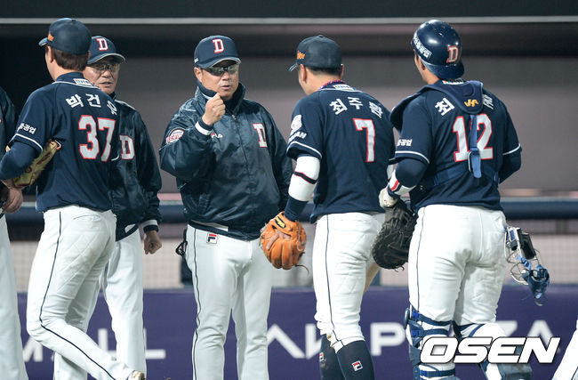 경기 종료 후 두산 김태형 감독이 선수들과 하이파이브를 하고 있다./sunday@osen.co.kr