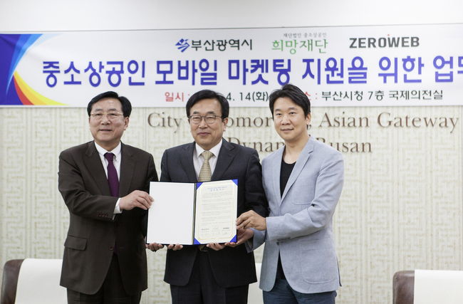스마트폰 홈페이지 무료제작을 통해 중소상공인을 위한 플랫폼 구축을 선도하고 있는 제로웹(이재현 대표)이 14일 부산광역시(서병수 시장), 중소상공인희망재단(김기문 이사장)과 '중소상공인 모바일 마케팅 지원 사업'을 위한 업무협약을 체결했다고 밝혔다.