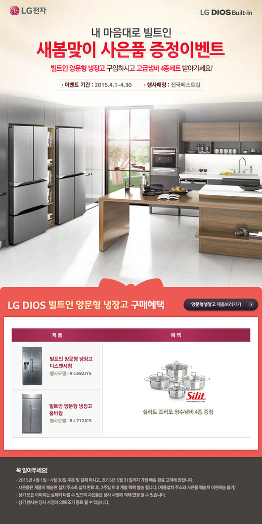이 달 말까지 진행되는 이 이벤트는 4월 30일까지 주문 및 결제 후 5월 31일까지 가정 배송 완료된 고객 대상으로 진행된다. 해당 제품으로는 빌트인 양문형 냉장고 디스펜서형(▲R-L692JYS)과 빌트인 양문형 냉장고 홈바형(▲R-L712JCS)이다.