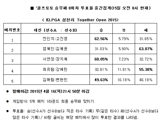 국민체육진흥공단(www.kspo.or.kr)이 발행하는 체육진흥투표권 수탁사업자인 스포츠토토 공식 온라인 발매 사이트인 베트맨(www.betman.co.kr)은 오는 17일에 아일랜드 CC에서 열리는 'KLPGA 삼천리 Together Open' 1라운드를 대상으로 한 골프토토 승무패 8회차 1번 매치에서 A선수인 전인지(62.56%)가 B선수인 고진영(31.65%)보다 우수한 성적을 기록할 것으로 예상했다고 밝혔다.