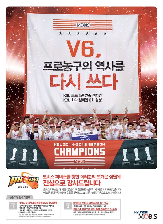 모비스 피버스는 지난 3월 KBL 2014-2015 시즌 정규리그 우승을 확정지은데 이어, 이달 4일 챔피언 결정전에서 동부 프로미를 상대로 4연승을 올리며 통합우승을 이뤘다. 모비스 피버스는 KBL 최초로 3연속 챔피언 자리에 오름과 동시에 챔피언 6회 달성이라는 신기록을 세웠다.
