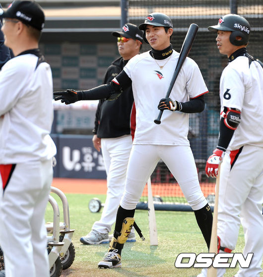 15일 오후 수원kt위즈파크에서 열리는 '2015 타이어뱅크 KBO 리그' kt 위즈와 두산 베어스의 경기 시작전 이대형이 타격 훈련을 기다리며 미소를 짓고 있다.
