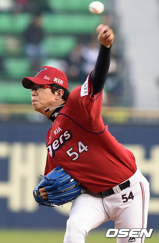 15일 오후 서울 잠실야구장에서 열린 '2015 타이어뱅크 KBO 리그' LG 트윈스와 KIA 타이거즈의 경기, 1회말 KIA 선발투수 양현종이 힘차게 공을 던지고 있다.