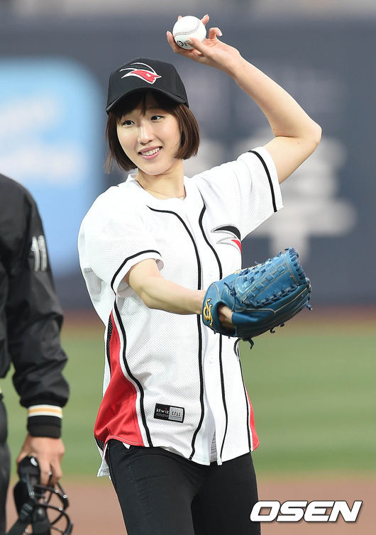 15일 오후 수원kt위즈파크에서 열린 '2015 타이어뱅크 KBO 리그' kt 위즈와 두산 베어스의 경기 시작전 황연주가 시구를 하고 있다.