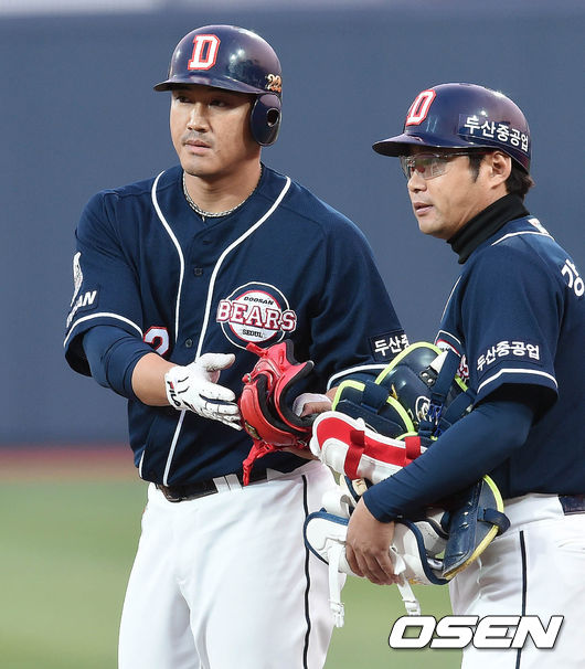 15일 오후 수원kt위즈파크에서 열린 '2015 타이어뱅크 KBO 리그' kt 위즈와 두산 베어스의 경기 1회초 무사 만루 홍성흔이 2타점 적시타를 치고 1루에서 보호대를 벗고 있다.