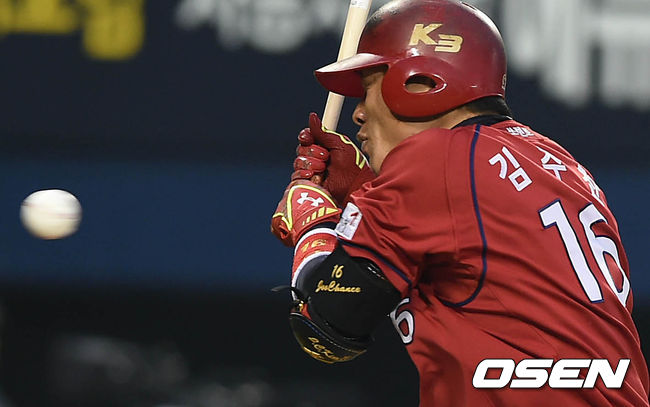 15일 오후 서울 잠실야구장에서 열린 '2015 타이어뱅크 KBO 리그' LG 트윈스와 KIA 타이거즈의 경기, 3회초 무사 주자 1,2루 KIA 김주찬이 몸에 맞는공으로 출루하며 만루가 되고 있다.