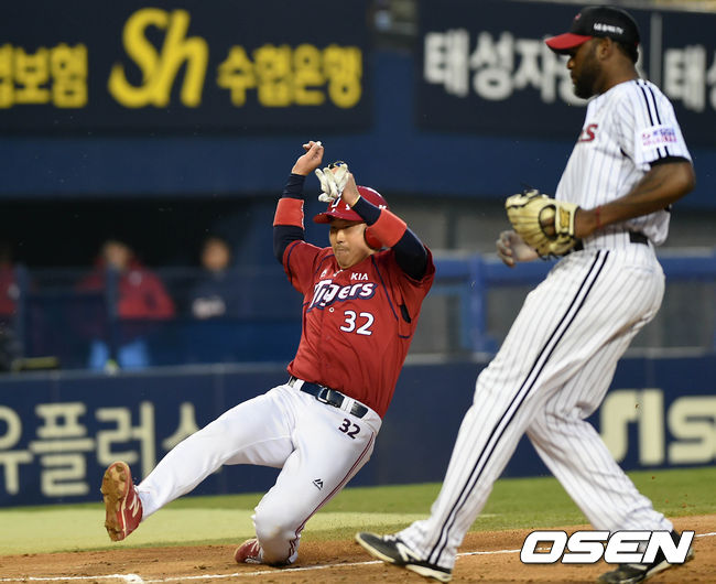 15일 오후 서울 잠실야구장에서 열린 '2015 타이어뱅크 KBO 리그' LG 트윈스와 KIA 타이거즈의 경기, 3회초 무사 주자 만루 LG 소사의 폭투를 틈타 3루주자 KIA 이성우가 홈을 밟고 있다.