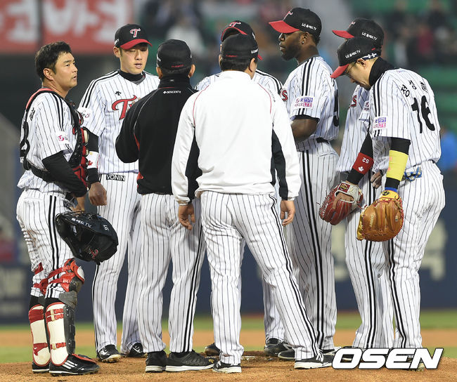 15일 오후 서울 잠실야구장에서 열린 '2015 타이어뱅크 KBO 리그' LG 트윈스와 KIA 타이거즈의 경기, 3회초 무사 만루 양상문 감독이 마운드를 방문해 선수들과 이야기를 나누고 있다.