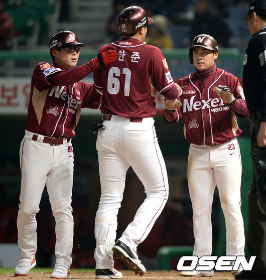 4회초 1사 1루에서 넥센 유한준이 우월 투런 홈런을 치고 홈에서 문우람과 하이파이브를 하고 있다.