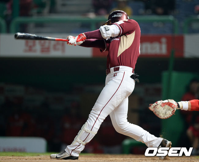 4회초 1사 1루에서 넥센 유한준이 우월 투런 홈런을 치고 있다.