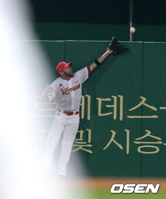 4회초 1사 1루에서 SK 브라운이 넥센 유한준의 타구를 잡으려 손을 뻗고 있다.