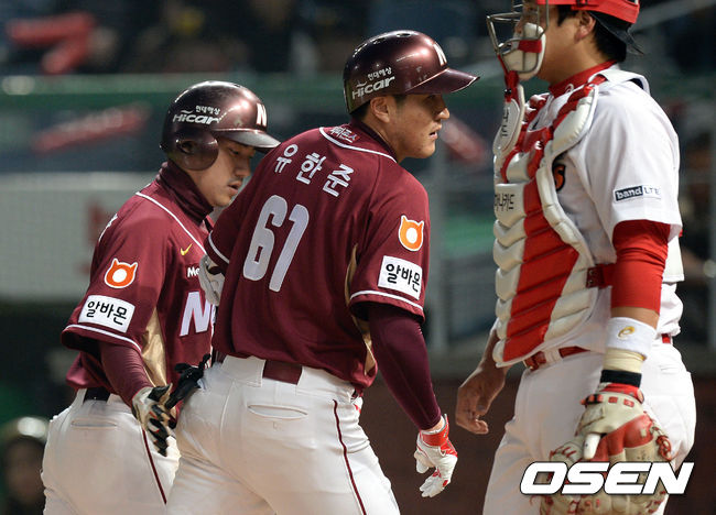 4회초 1사 1루에서 넥센 유한준이 우월 투런 홈런을 치고 홈에서 문우람과 하이파이브를 하고 있다.