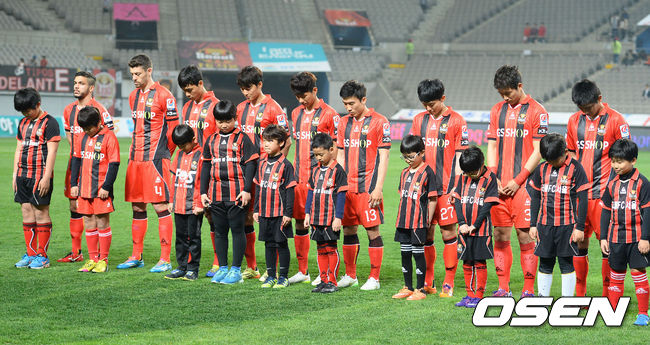 경기에 앞서 FC 서울 선수들이 세월호 참사 희생자들을 위한 묵념을 하고 있다.