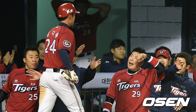 15일 오후 서울 잠실야구장에서 열린 '2015 타이어뱅크 KBO 리그' LG 트윈스와 KIA 타이거즈의 경기, 4회초 무사 주자 1,3루 KIA 최용규의 안타에 홈을 밟은 김다원이 기쁨을 나누고 있다.
