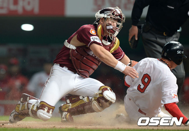 4회말 2사 1,2루에서 SK 이재원 우전 안타때 홈으로 쇄도한 2루주자 박재상이 태그아웃 처리되고 있다.