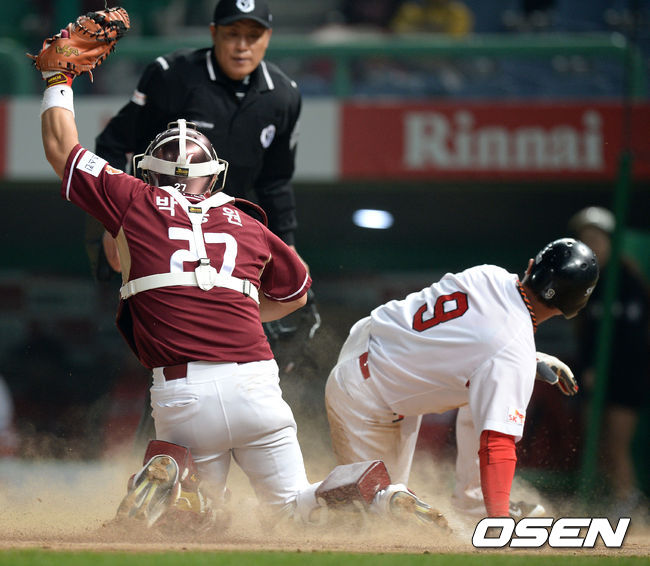 4회말 2사 1,2루에서 SK 이재원 우전 안타때 홈으로 쇄도한 2루주자 박재상이 태그아웃 처리되고 있다.