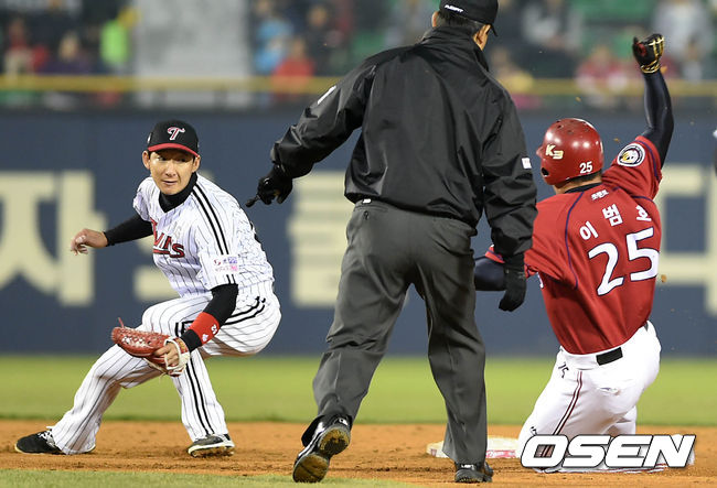 15일 오후 서울 잠실야구장에서 열린 '2015 타이어뱅크 KBO 리그' LG 트윈스와 KIA 타이거즈의 경기, 5회초 1사 주자 1루 KIA 김다원의 타석에 1루주자 이범호가 2루 도루를 시도하다 아웃됐다.