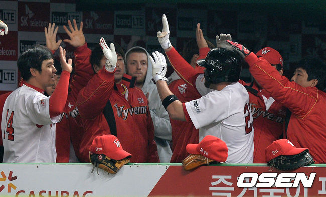 6회말 무사에서 SK 브라운이 중월 솔로 홈런을 치고 더그아웃에서 동료들의 축하를 받고 있다.