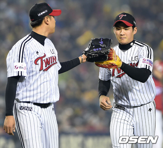 15일 오후 서울 잠실야구장에서 열린 '2015 타이어뱅크 KBO 리그' LG 트윈스와 KIA 타이거즈의 경기, 6회초 1사 주자 2루 LG 오지환이 KIA필의 타구를 처리하고 투수 김선규와 기쁨을 나누고 있다.