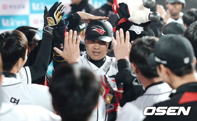 15일 오후 수원kt위즈파크에서 열린 '2015 타이어뱅크 KBO 리그' kt 위즈와 두산 베어스의 경기 5회말 무사 1루 김상현이 투런홈런을 치고 덕아웃에서 동료들과 하이파이브를 하고 있다.