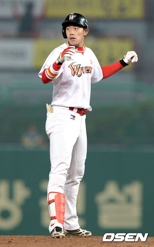 5회말 2사 1루에서 SK 이명기가 좌중간을 가르는 적시 2루타를 치고 타임을 외치고 있다.