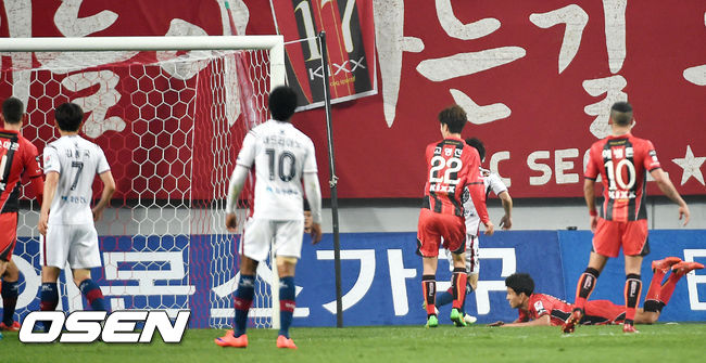경기 후반,서울 김현성이 헤딩슛으로 골을 성공시키고 있다.