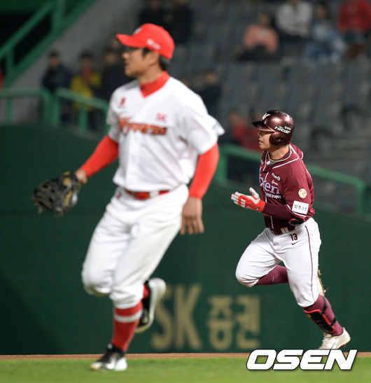 8회초 1사 만루에서 넥센 윤석민이 좌중간을 가르는 3타점 적시 2루타를 치고 그라운드를 달리고 있다.