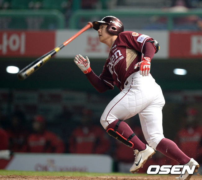8회초 1사 만루에서 넥센 윤석민이 좌중간을 가르는 3타점 적시 2루타를 치고 있다.