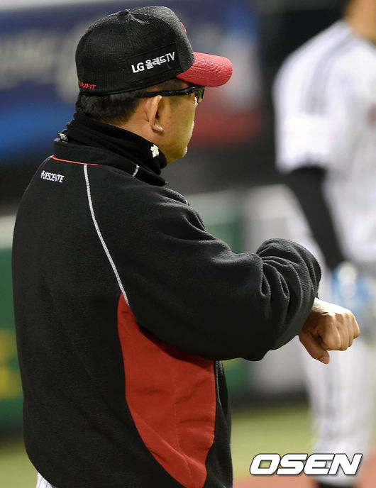 15일 오후 서울 잠실야구장에서 열린 '2015 타이어뱅크 KBO 리그' LG 트윈스와 KIA 타이거즈의 경기, 7회말 무사 주자 1루 LG 문선재의 2루 도루시도에 대한 KIA 김기태 감독의 항의로 경기가 지연되자 LG 양상문 감독이 심판에게 어필하고 있다.