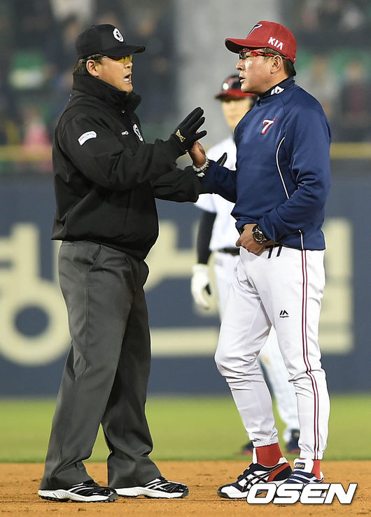 KIA 타이거즈 김기태 감독이 상대 팀의 주루플레이를 두고 항의하다가 퇴장 당했다.