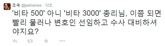 15일 조국 서울대 법학전문대학원 교수는 이날 자신의 트위터에 "비타500 박스를 5만 원 권으로 채우면 얼마?"라며 "비타 500 아니 비타 3000 총리님, 이쯤 되면 빨리 물러나 변호인 선임하고 수사 대비하셔야지요?"라는 글을 올리며 이완구 총리를 향해 비난을 아끼지 않았다.