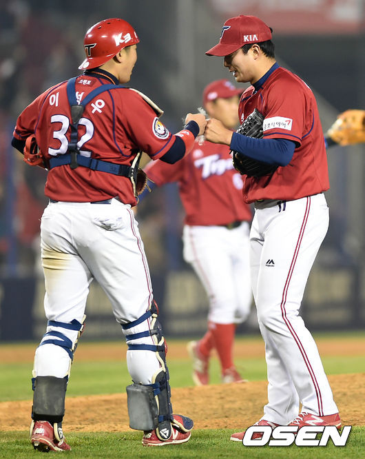 경기종료후 KIA 임준섭 과 이성우가 기쁨을 나누고 있다./greenfield@osen.co.kr