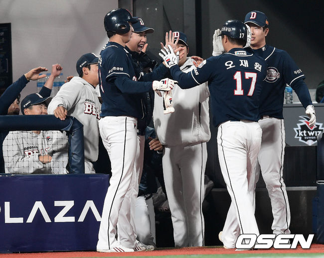 15일 오후 수원kt위즈파크에서 열린 '2015 타이어뱅크 KBO 리그' kt 위즈와 두산 베어스의 경기 9회초 2사 1,2루 대타 오재원이 2타점 2루타로 동점을 만들고 덕아웃에서 동료들의 축하를 받고 있다.